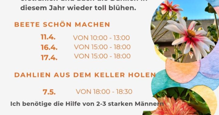 Wer macht mit? Veröffentlicht am März 10, 2026März 10, 2026 von Admin_BHV Veröffentlicht in Allgemeines und verschlagwortet mit Beete, Blumen, Bürgerhaus, Dahlien.