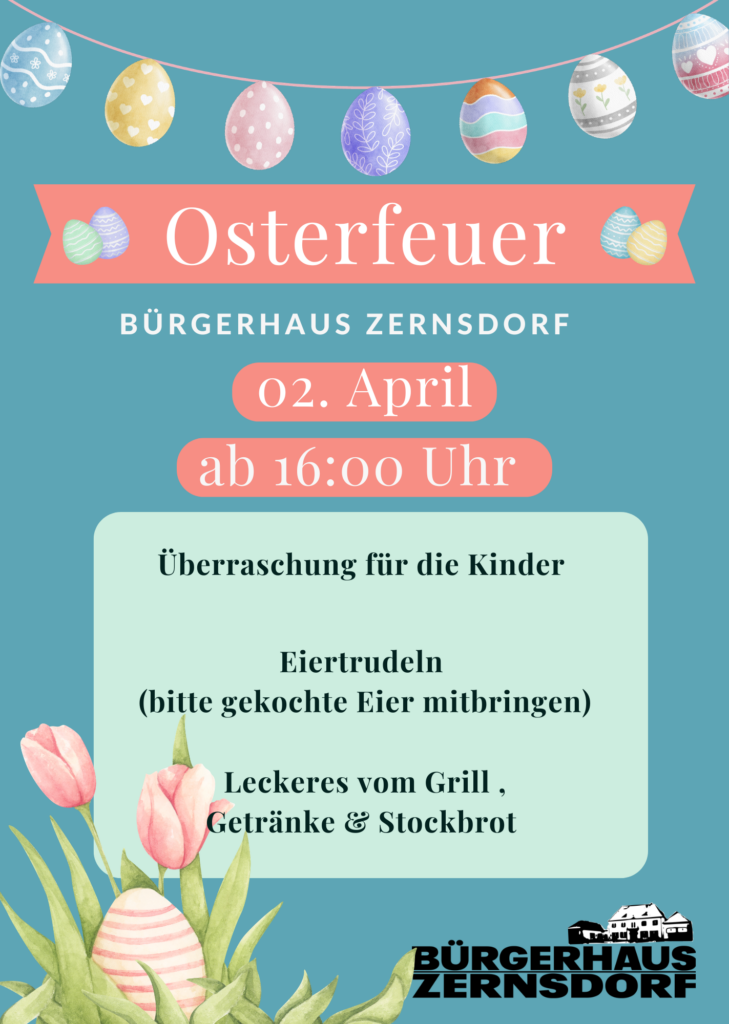 02.04.2026 – Osterfeuer Veröffentlicht am März 10, 2026März 10, 2026 von Admin_BHV Veröffentlicht in Veranstaltungen und verschlagwortet mit Bügerhaus, Eiertrudeln, Feuerschale, Osterfeuer, Osterhase, Ostern, Zernsdorf.