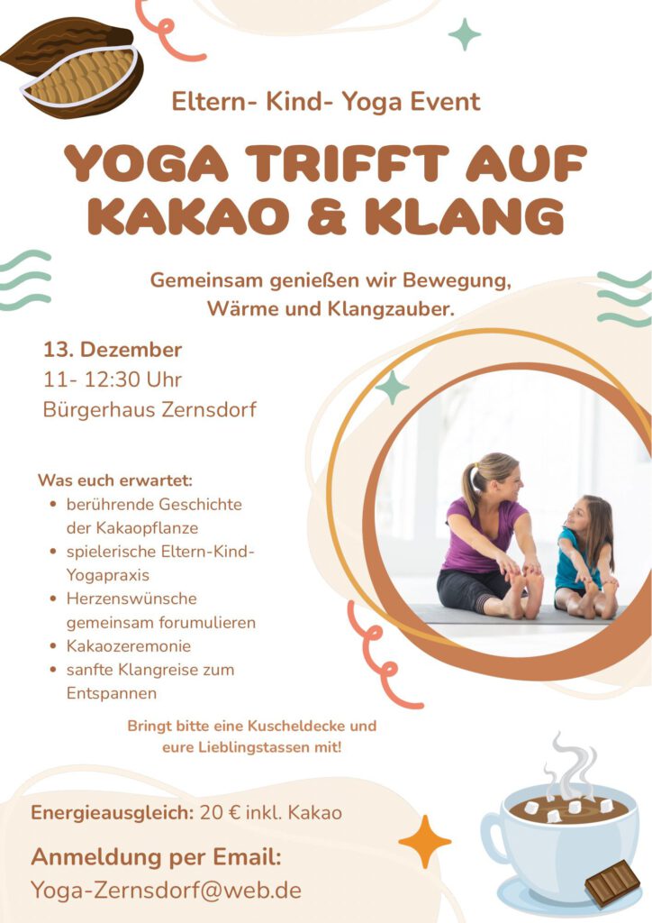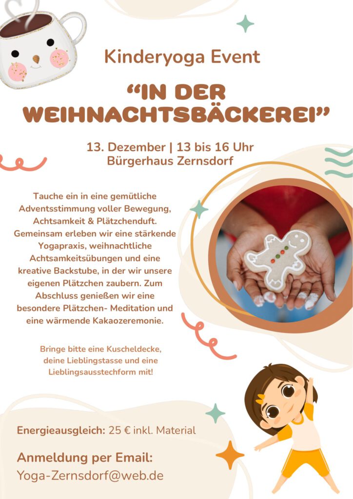 13.2.2025 Yoga-Special mit Maria Veröffentlicht am Oktober 14, 2025Oktober 14, 2025 von Admin_BHV Maria lädt euch ein zu einem ganz besonderen Yoga-Special in der Vorweihnachtszeit! Veröffentlicht in Veranstaltungen und verschlagwortet mit backen, Bürgerhaus Zernsdorf, Eltern-Kind, Kakakozeremonie, Kinderyoga mit Maria, Plätzchen, weihnachten, yoga, Yoga Zernsdorf, Zernsdorf.